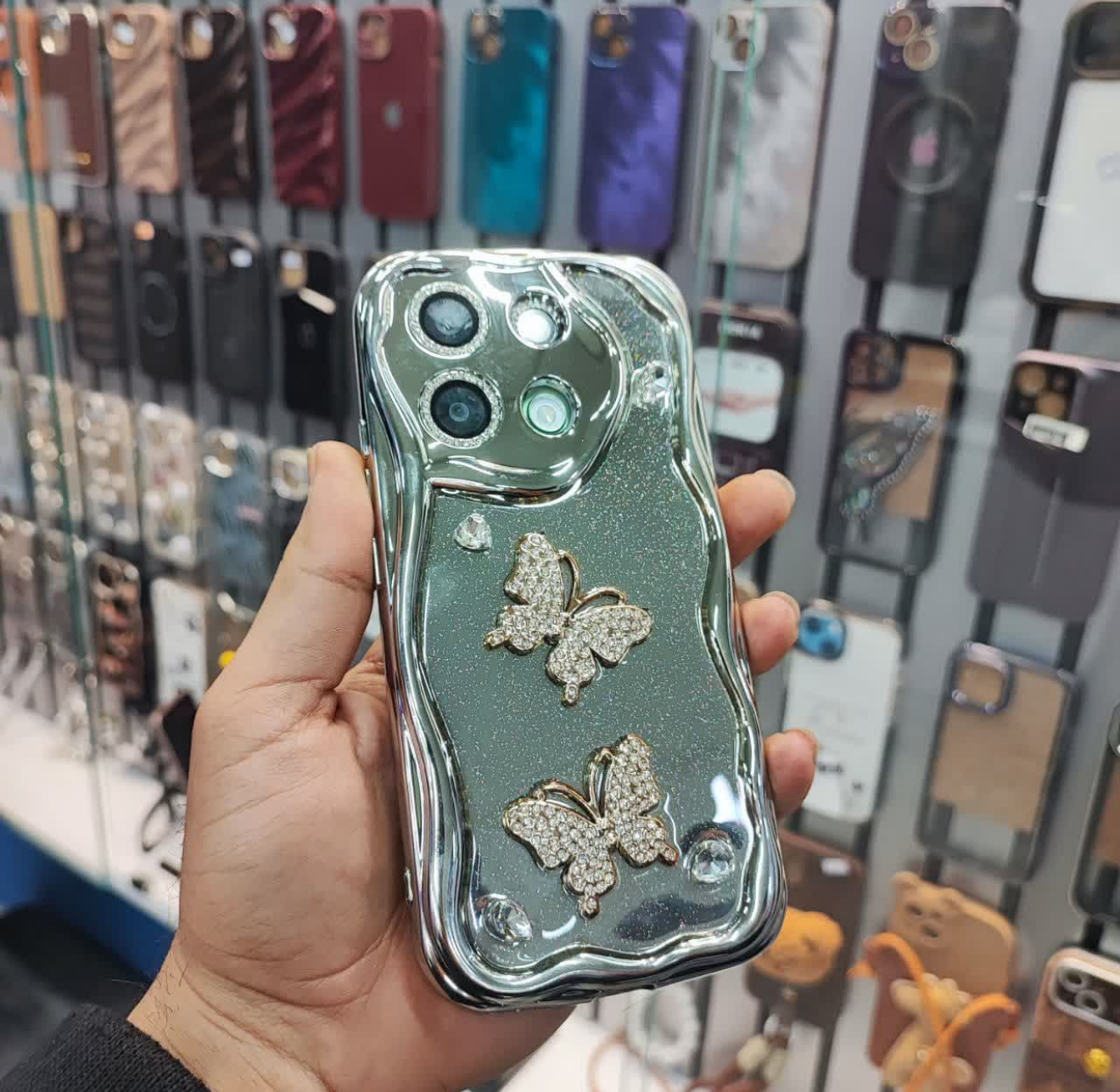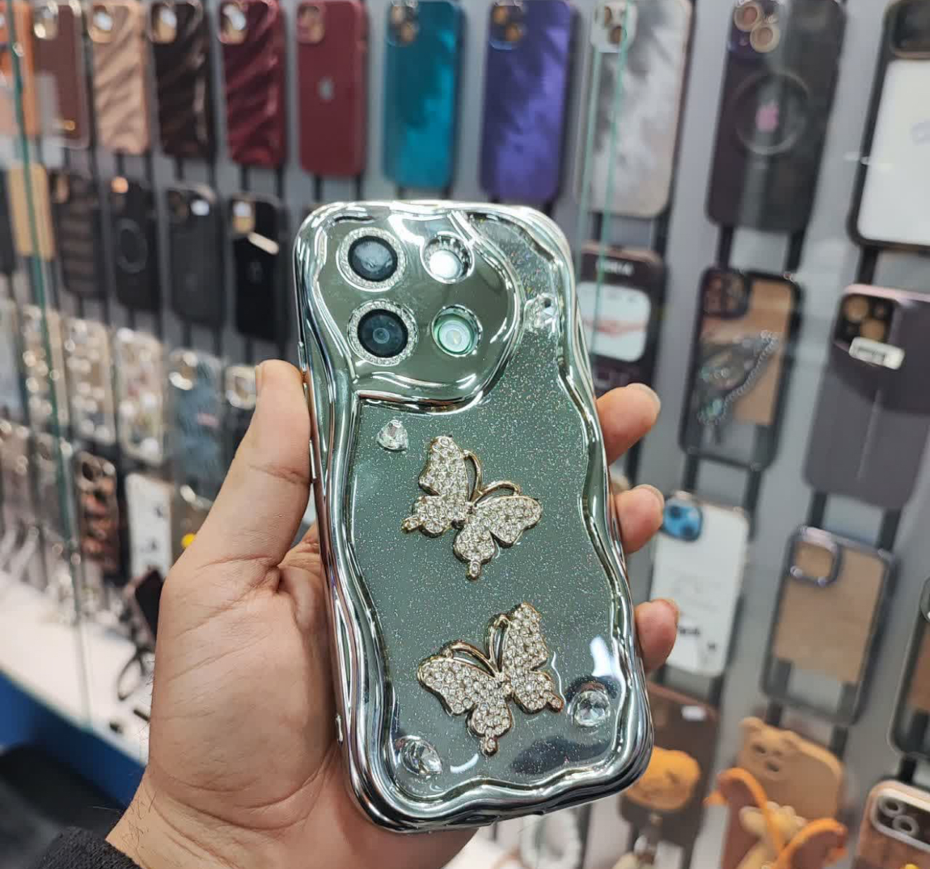 قاب کاور گارد دو پروانه طلایی الماسی نگین دار بدون بند برای گوشی آیفون۱۳ / آیفون ۱۳ / iphone13 / iphone 13